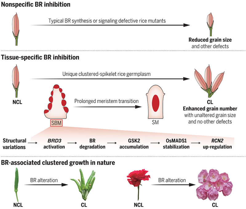 本文破譯了復(fù)粒稻多粒簇生形成的機(jī)制,發(fā)現(xiàn)了控制簇生形成的基因編碼植物激素油菜素甾醇(BR)的代謝基因,解析了激素信號(hào)通路如何以精確的時(shí)空方式作用以提高水稻的籽粒數(shù)。