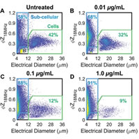 近期,美國弗吉尼亞大學的科研人員利用阻抗流式細胞儀Ampha Z32測定分析了經吉西他濱處理的胰腺腫瘤培養(yǎng)基上清液中ABs,所得測量結果與常規(guī)方法提取出的凋亡細胞所表現(xiàn)出表型特征一致。