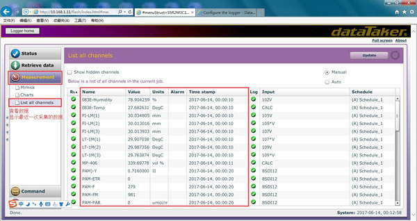 具有測(cè)量模擬量、數(shù)字量、高速計(jì)數(shù)器輸入量、相位編碼器輸入量和可編程串行數(shù)據(jù)量的傳感器通道,因此可簡單、直接的連接多種不同形式的傳感器和數(shù)據(jù)測(cè)量裝置。AgriPhenoCloud DT80可用于采集溫度、電壓、電流、4-20mA回路電流、電阻、電橋、應(yīng)變儀、頻率、數(shù)字,或連接智能傳感器進(jìn)行數(shù)據(jù)采集,同時(shí)可對(duì)采集到的不同原始數(shù)據(jù)進(jìn)行計(jì)算,按所需要的工作單位或統(tǒng)計(jì)報(bào)告的形式將原始數(shù)據(jù)或計(jì)算結(jié)果返回到上位機(jī)。通過計(jì)劃設(shè)置實(shí)現(xiàn)分組采集、數(shù)據(jù)記錄、報(bào)警設(shè)置和控制作業(yè)以滿足不同的測(cè)量要求。智能傳感器、GPS、PLC和其他智能裝置可通過DT80的兩個(gè)串行傳感器接口(RS232或RS422、485)進(jìn)行連接。客戶可選用 dataTaker的CANgate與DT80連接,實(shí)現(xiàn)CAN總線監(jiān)測(cè)及數(shù)據(jù)采集。