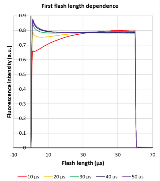 下圖顯示了一組測量值,根據(jù)這些測量值可以確定類胡蘿卜素三重態(tài)衰變動力學(xué)。該數(shù)據(jù)集說明了閃光時間的精度,以及閃光燈提供兩次相隔1μs的相同強度閃光的能力。