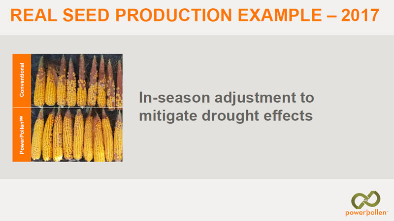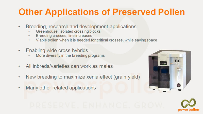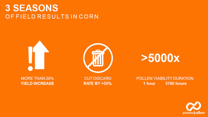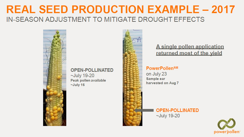 因異花授粉時機(jī)不當(dāng),已導(dǎo)致全球雜交玉米產(chǎn)量損失15%-25%。在正常情況下,花粉在吐絲后一兩天內(nèi)脫落,使果殼充分受精。然而,當(dāng)雄株的最佳散粉期與雌株的最佳吐絲期不同步時,就無法成功受精形成籽粒。PowerPollen?公司提供的玉米授粉解決方案,改善花粉保存條件,可在雌株具備最佳的受粉能力時,為種子生產(chǎn)者提供大量高活性玉米花粉,進(jìn)而最大限度地提高種子純度、產(chǎn)量,降低了作物產(chǎn)量下降的風(fēng)險,從而提高了投資回報率。PowerPollen?公司的授粉解決方案已幫助種子生產(chǎn)者在雜交玉米種子生產(chǎn)過程中,生產(chǎn)田的單產(chǎn)提高20%以上。