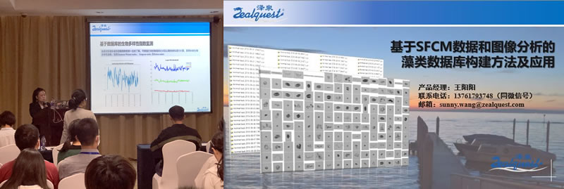 藻類多樣性監(jiān)測和快速分類一直是急需解決的復(fù)雜問題。為科研工作提供高效的藻類研究工具也是我們的初衷,澤泉科技的產(chǎn)品經(jīng)理王陽陽在會上向與會專家分享了基于SFCM數(shù)據(jù)和圖像分析的藻類數(shù)據(jù)庫構(gòu)建方法及應(yīng)用。運(yùn)用專為浮游植物分析設(shè)計(jì)的CytoSense流式細(xì)胞(SFCM) 快速采樣,獲取的高通量單細(xì)胞數(shù)據(jù)經(jīng)自動聚類分析軟件EasyClus 聚類、自動分析結(jié)合大數(shù)據(jù)挖掘、機(jī)器學(xué)習(xí),實(shí)現(xiàn)藻類數(shù)據(jù)庫的構(gòu)建,從而最終應(yīng)用于藻類現(xiàn)場的快速分類監(jiān)測。我們也通過墻報(bào)展示了該系統(tǒng)應(yīng)用的細(xì)節(jié)。會議期間,澤泉科技設(shè)立展臺,與參會嘉賓就藻類研究相關(guān)技術(shù)及應(yīng)用方面的問題做了詳細(xì)的溝通交流。