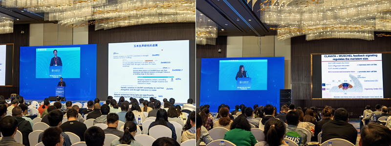 四川農業(yè)大學校長吳德出席開幕式并致辭,他向與會專家介紹了四川農業(yè)大學的基本情況,展望了玉米產業(yè)在“產量要更高、科技要更強、農民要更富”3個背景下的新一輪發(fā)展機遇,希望通過此次會議,充分展示我國玉米、作物乃至植物研究領域的最新理論成果,成為作物生物學研究領域專家和學者加強溝通、相互學習、攜手進步的盛會。同時,祝愿與會專家學者在學科前沿、基礎理論、引領技術等方面取得新的更大突破,共同為我國糧食安全和現代農業(yè)發(fā)展貢獻自己的智慧和力量。圍繞玉米復雜農藝性狀遺傳與發(fā)育、應答生物與非生物脅迫、基因組與表觀遺傳、分子育種理論與方法技術四個主題,組委會邀請了中國農科院萬建民院士、中國科學院分子植物卓越中心林鴻宣院士、中國農業(yè)大學陳紹江教授、中科院上海植物生理生態(tài)研究所王二濤研究員做大會報告,還邀請了美國科學院院士、蘇里大學的James A. Birchler教授和美國科學院院士、加州大學伯克利分校Michael Freeling教授做線上報告。同時,組委會從收集的221份會議摘要中遴選了22個邀請報告和13個研究生(青年教師)交流報告,并對156份學術墻報安排時間進行專項交流。大會評選優(yōu)秀報告獎10名和墻報獎24個。本次會議集中反映了我國玉米科學基礎研究的最新成果,介紹了國內外玉米研究的最新進展,給參會代表帶來了研究的新思路與新方向,達到了促進玉米科研工作者加強理論創(chuàng)新、人才培養(yǎng)與合作交流的目的。