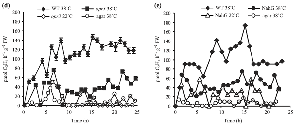 實驗內(nèi)容簡介:以生長 3 周的擬南芥野生型 Col-0,突變體 NahG 和 opr3 植株為材料,研究了其高溫脅迫下的乙烯釋放。其中,野生型 Col-0 高溫脅迫(38℃)下,電導率(電解質(zhì)滲透率)、水楊酸和茉莉酸含量和乙烯釋放增加;突變體 NahG 和 opr3 高溫脅迫(38℃)下電導率、茉莉酸和乙烯釋放也增加,但都低于野生型 Col-0,而高溫脅迫后恢復階段(水中 22℃)電導率明顯高于 Col-0。研究結(jié)果表明:高溫脅迫下,乙烯迅速產(chǎn)生,其生產(chǎn)受到茉莉酸和水楊酸的調(diào)控。總的來說,茉莉酸與水楊酸協(xié)同調(diào)節(jié)植物對高溫脅迫的耐受,而乙烯主要加快細胞死亡;突變體 NahG 和 opr3 比野生型 Col-0 的耐熱性差,細胞死亡多。