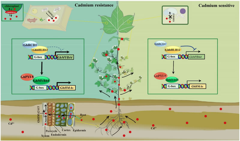 本研究揭示了氧化脅迫調(diào)控蛋白GhRCD1通過調(diào)控GhbHLH12-GhMYB44-GhHMA1轉(zhuǎn)錄級聯(lián)通路響應(yīng)鎘脅迫的分子機制,為培育耐鎘棉花新品種和通過植物修復(fù)手段降低鎘污染提供了新思路。